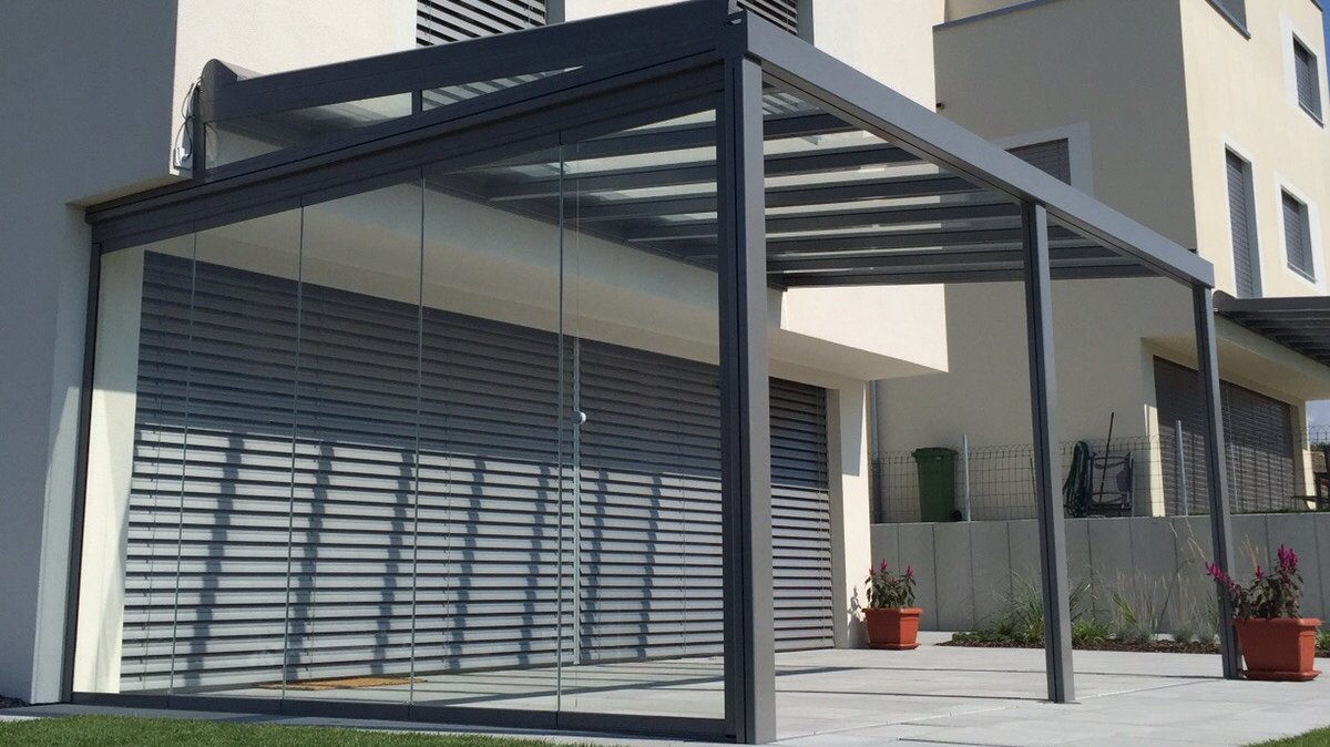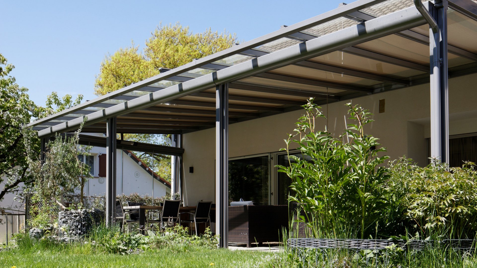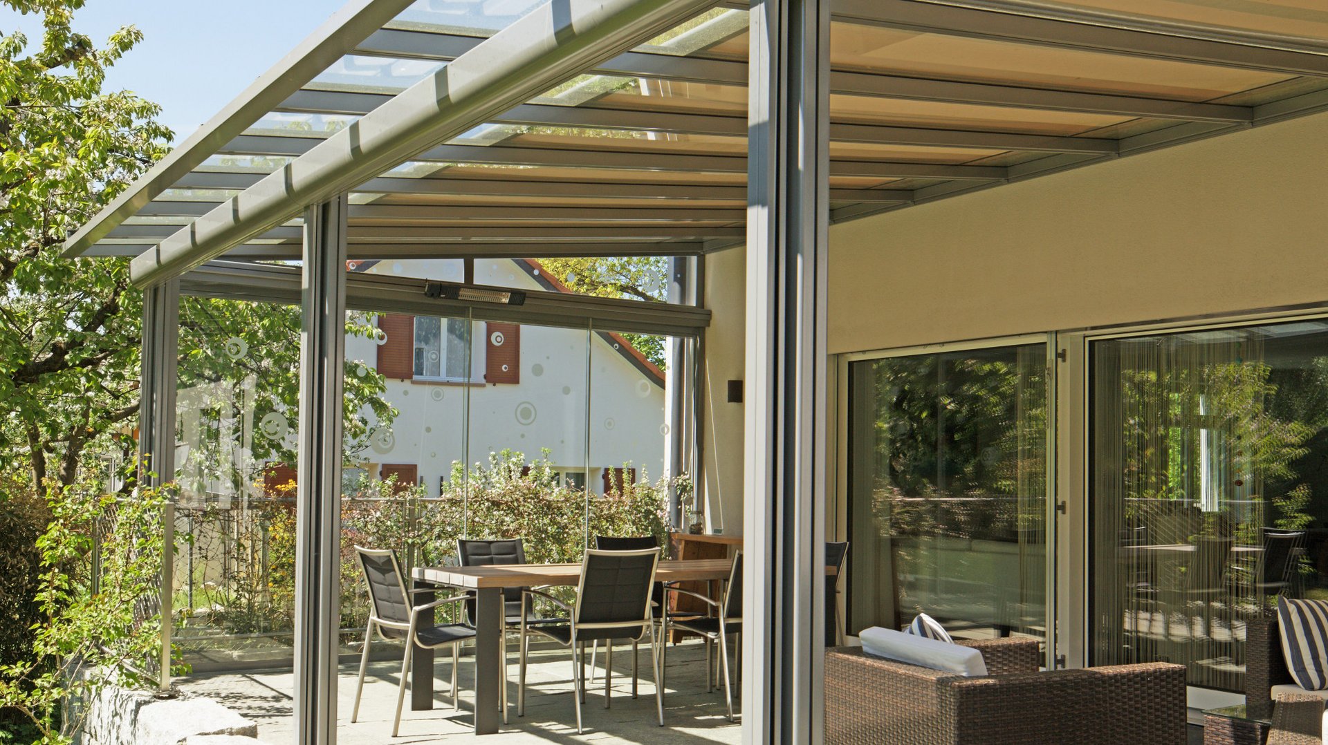 La nostra copertura per terrazza è un esempio perfetto di tettoia vetrata. La tettoia vetrata trasparente è fissata direttamente al muro della casa permettendo libera visuale verso l’alto senza interrompere l’incidenza della luce nello spazio abitativo. Si adatta in modo eccellente e in tutte le stagioni come protezione permanente sotto cui riporre tutto l’anno mobili e grill. Nelle torride giornate d’estate, la copertura con tenda garantisce con efficacia un ambiente raffrescato e ombreggiato. La sofisticata eppur robusta copertura per terrazza si adatta perfettamente ai più svariati stili architettonici ed è quindi ideale per angoli relax medio-piccoli di giardini e per terrazze sul tetto creando, con un’illuminazione a LED dimmerabile e tende verticali in tessuto laterali, la perfetta atmosfera da lounge.