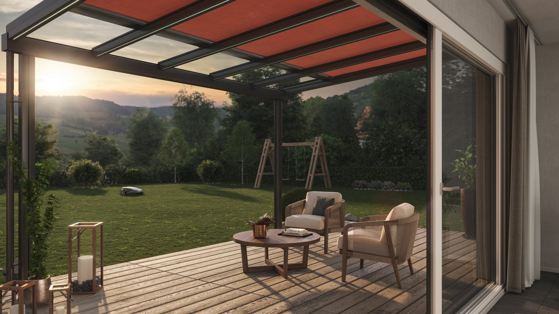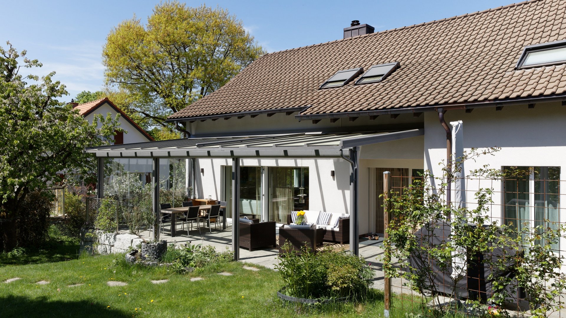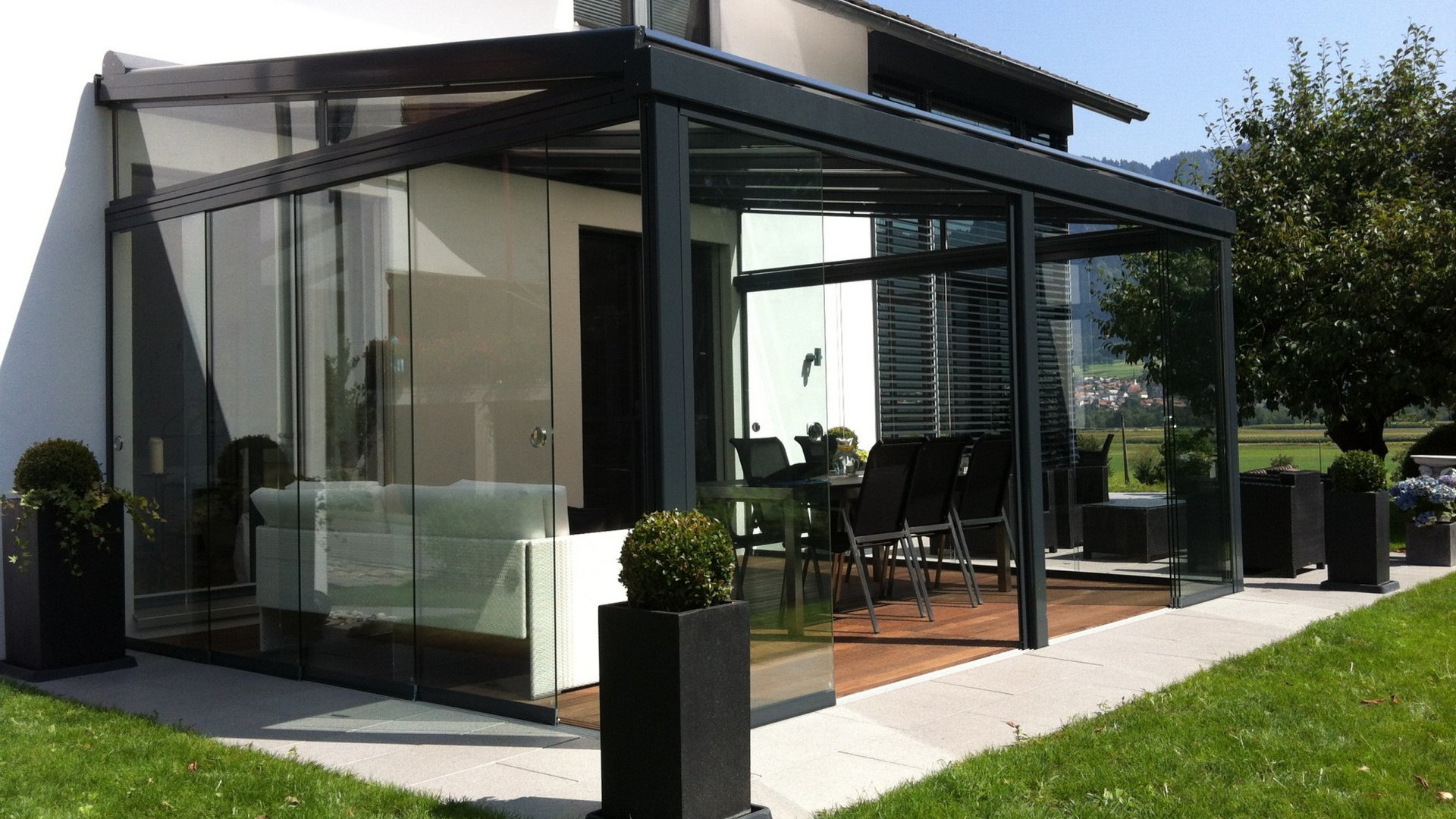 La nostra copertura per terrazza è un esempio perfetto di tettoia vetrata. La tettoia vetrata trasparente è fissata direttamente al muro della casa permettendo libera visuale verso l’alto senza interrompere l’incidenza della luce nello spazio abitativo. Si adatta in modo eccellente e in tutte le stagioni come protezione permanente sotto cui riporre tutto l’anno mobili e grill. Nelle torride giornate d’estate, la copertura con tenda garantisce con efficacia un ambiente raffrescato e ombreggiato. La sofisticata eppur robusta copertura per terrazza si adatta perfettamente ai più svariati stili architettonici ed è quindi ideale per angoli relax medio-piccoli di giardini e per terrazze sul tetto creando, con un’illuminazione a LED dimmerabile e tende verticali in tessuto laterali, la perfetta atmosfera da lounge.