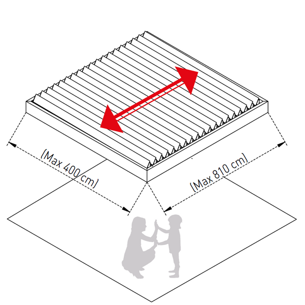 La pergola bioclimatica può essere montata anche orizzontalmente al muro. Di conseguenza, in questo caso, la rotazione delle lamelle avrà luogo in senso verticale o da sinistra a destra o da destra a sinistra. La struttura nasconde in modo sicuro tutti gli elementi di fissaggio rendendoli invisibili.
