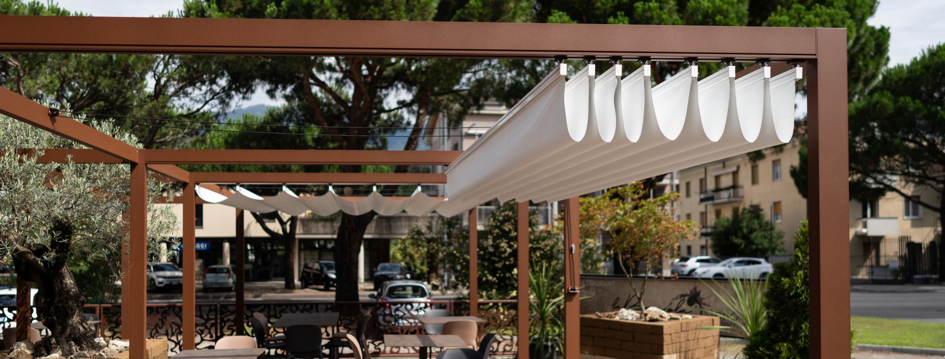La pergola retrattile in tessuto offre ombra piacevole e crea un’atmosfera accogliente, ideale quando serve una soluzione di ombreggiamento pratica e flessibile.