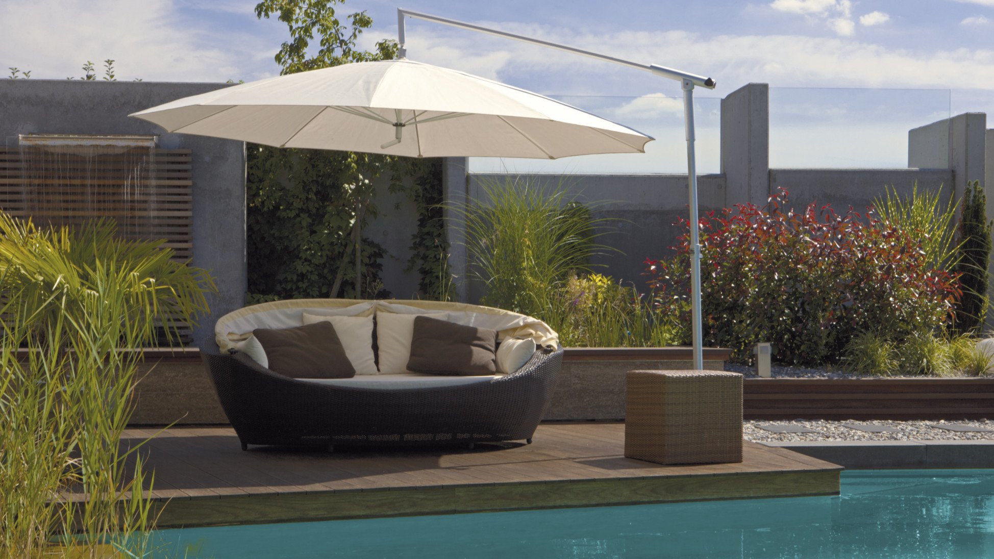Per l’ombrellone a sospensione Dacapo è disponibile una interessante gamma di opzioni. Questo prodotto può essere così adattato in maniera ottimale ai desideri e alle esigenze individuali. Tessuti nelle più svariate fantasie e numerose funzioni vi aiuteranno ad allestire in modo elegante terrazze, balconi e spazi relax in giardino.