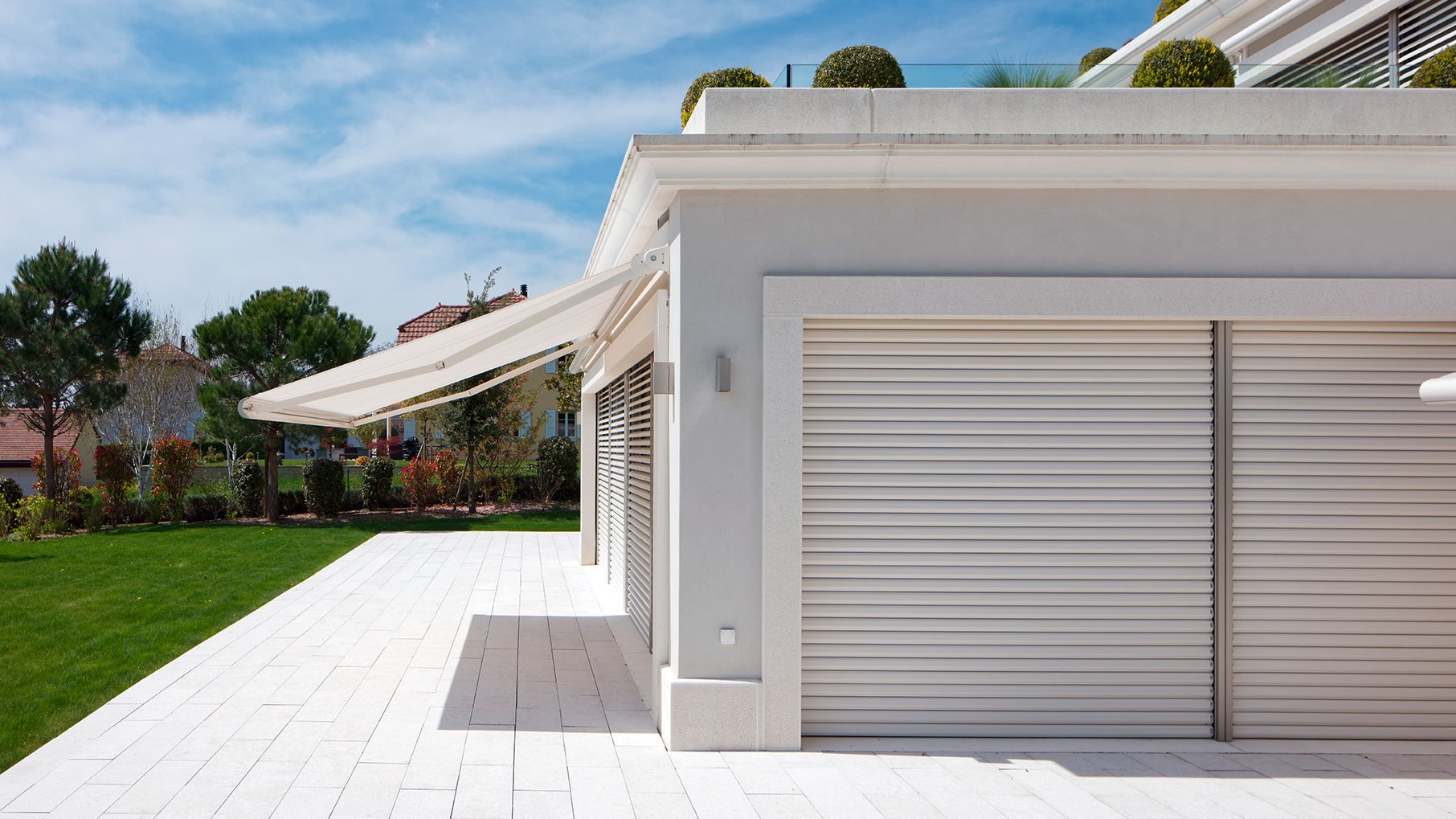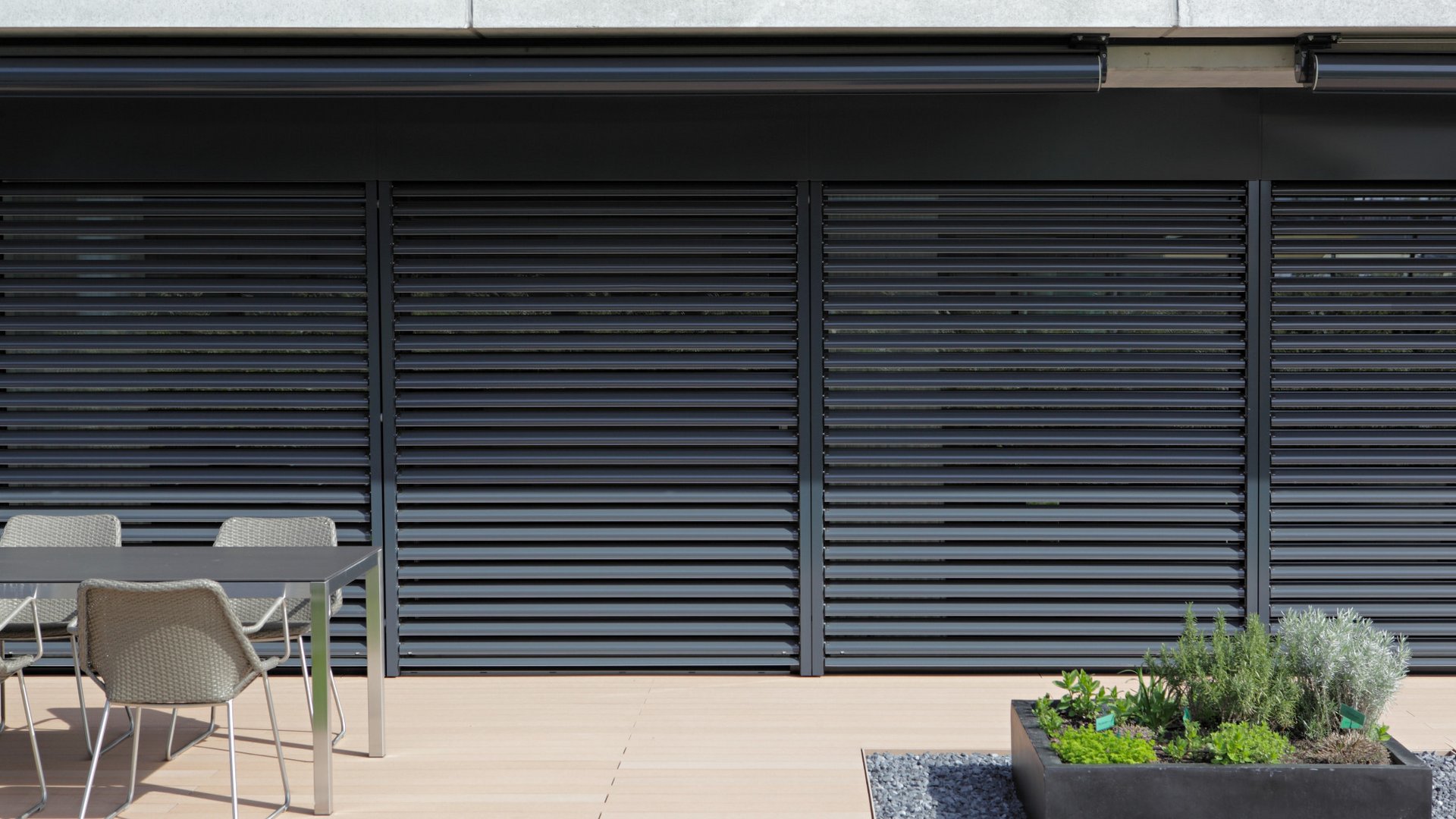 In questa situazione di montaggio, la persiana interamente metallica si integra completamente nell’architrave. Quando è chiusa, la tenda è integrata nella facciata. In tal modo la facciata conserva un aspetto pulito.